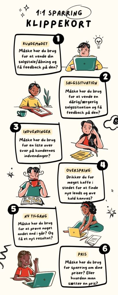 Med 1:1 sparring får du personlig hjælp til dine salgsmæssige udfordringer – fra at møde kunderne med selvtillid til at sige de rigtige ting på det rette tidspunkt.